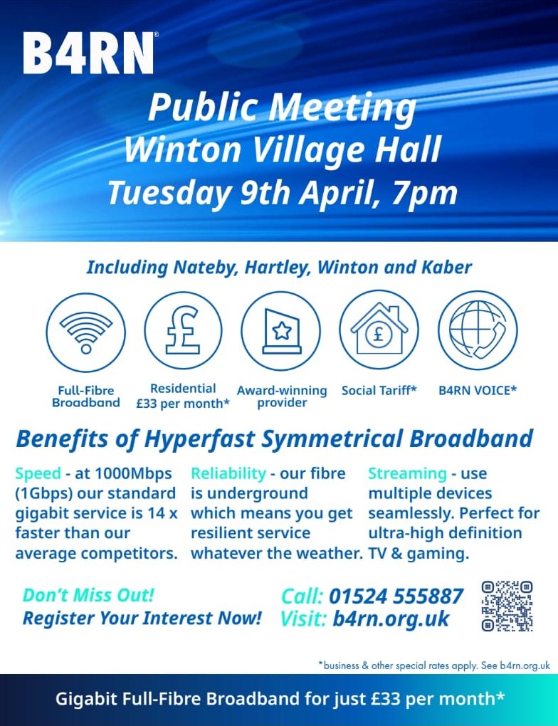 In wider news, we understand that B4RN has raised all the money needed to start on the installation of our all-fibre gigabit internet, so we will be joining the internet revolution within the year (hopefully). Thanks go to a number of volunteers around the village for making this happen, with notable mentions to Mike Bidgeway for his stoic and persistent campaigning over the years, to Liz Staley for galvanising the community into supporting the project and Julie Lane for all the work on way-leaves – well done all.